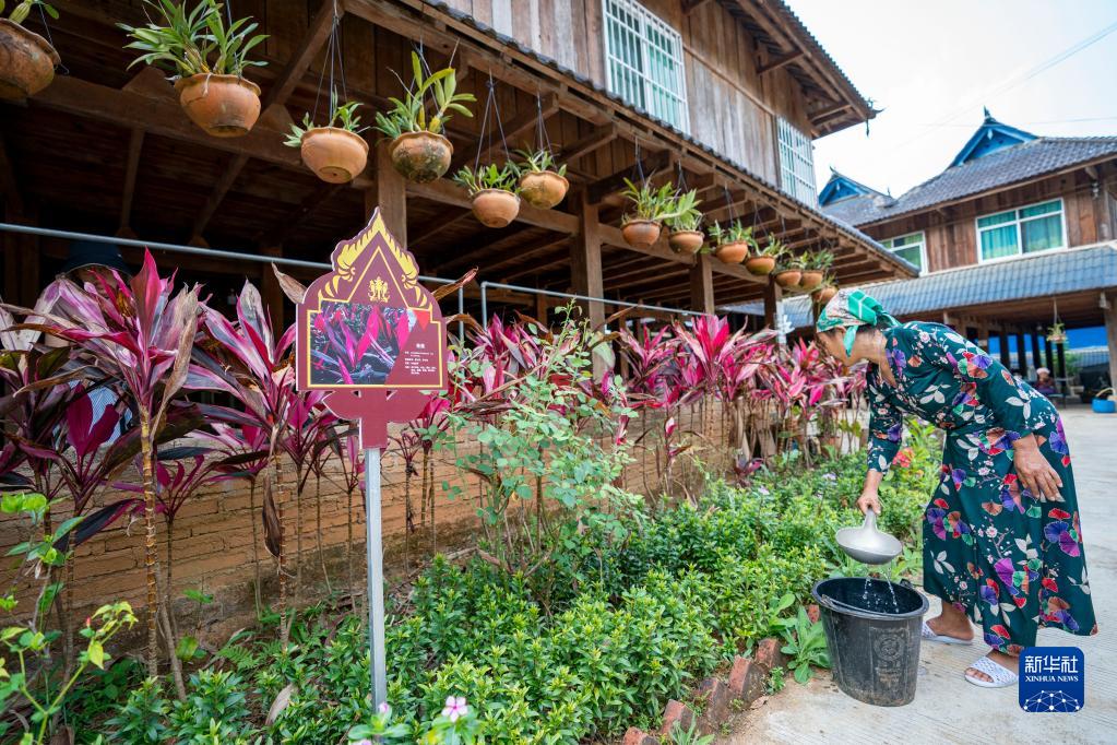 在景洪市嘎洒镇曼点村委会曼吕村小组,当地居民在给自家房屋周边种植的朱蕉浇水(3月16日摄)。新华社记者 陈欣波 摄