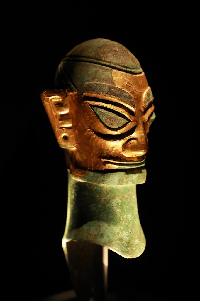 三星堆博物馆内陈列的戴金面罩青铜人头像。新华社记者刘琼摄