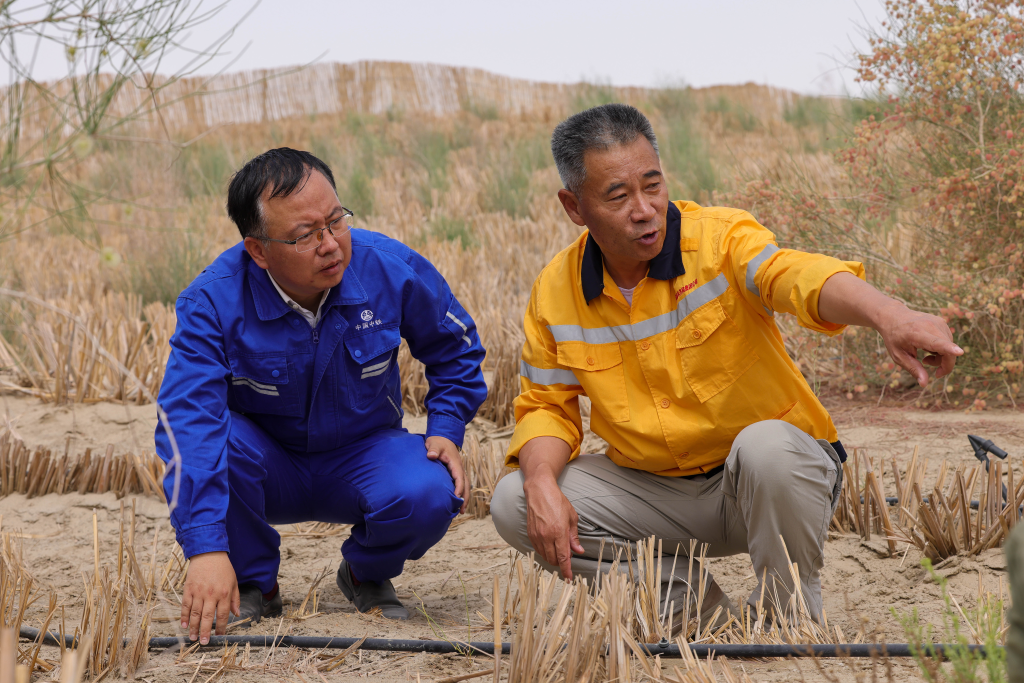 王尽忠(右)和中铁一局的工作人员查看和若铁路沿线植物生长情况(5月19日摄)。 新华社记者丁磊 摄