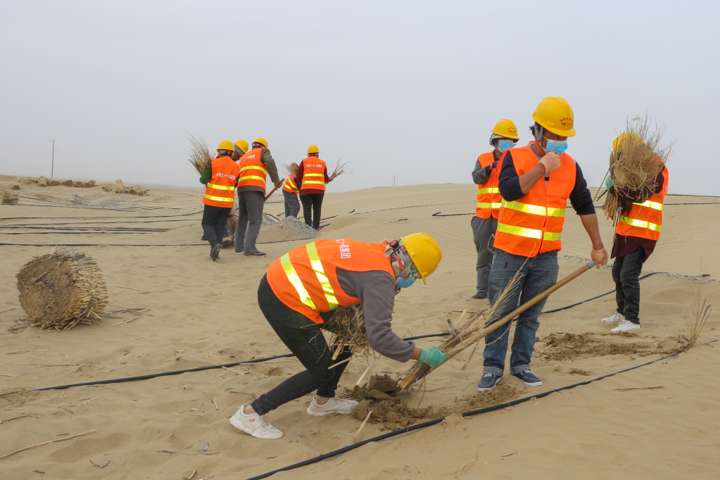 在和若铁路沿线,工作人员在种植防沙植物(2020年3月24日摄)。(受访者供图)
