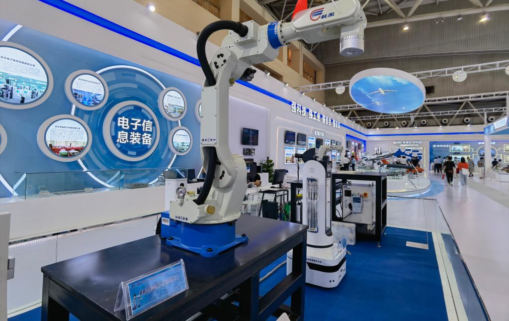 这是兰洽会主展馆先进装备馆展出的工业机器人。新华社记者 王铭禹 摄