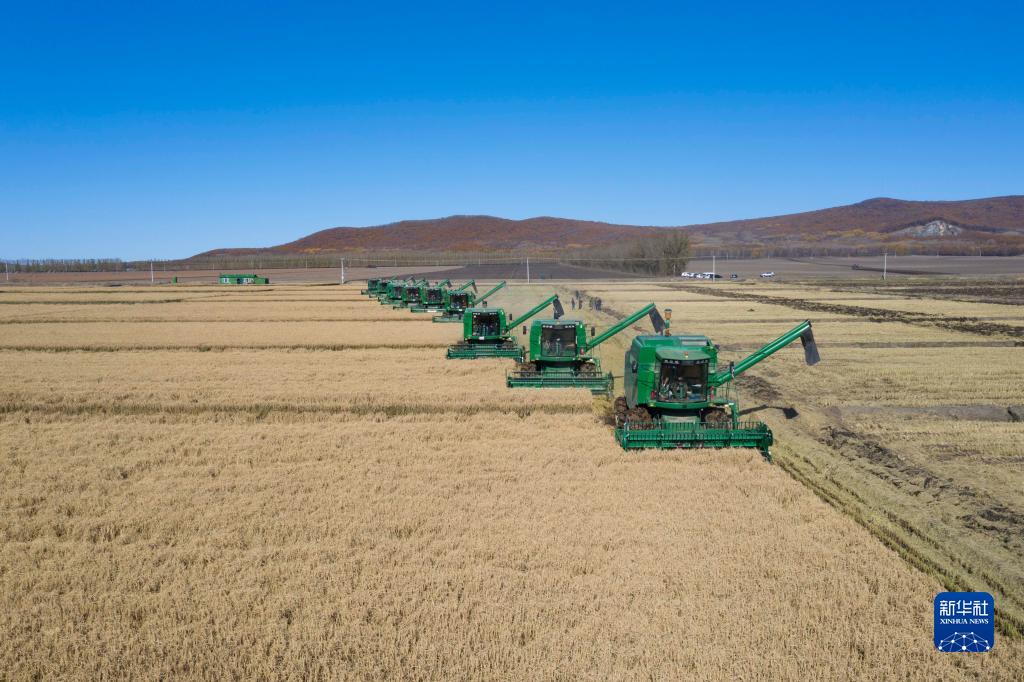 在黑龙江省农垦勤得利农场,种植户驾驶机械收割水稻(2019年10月12日摄,无人机照片)。新华社发(谢剑飞 摄)