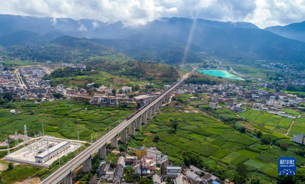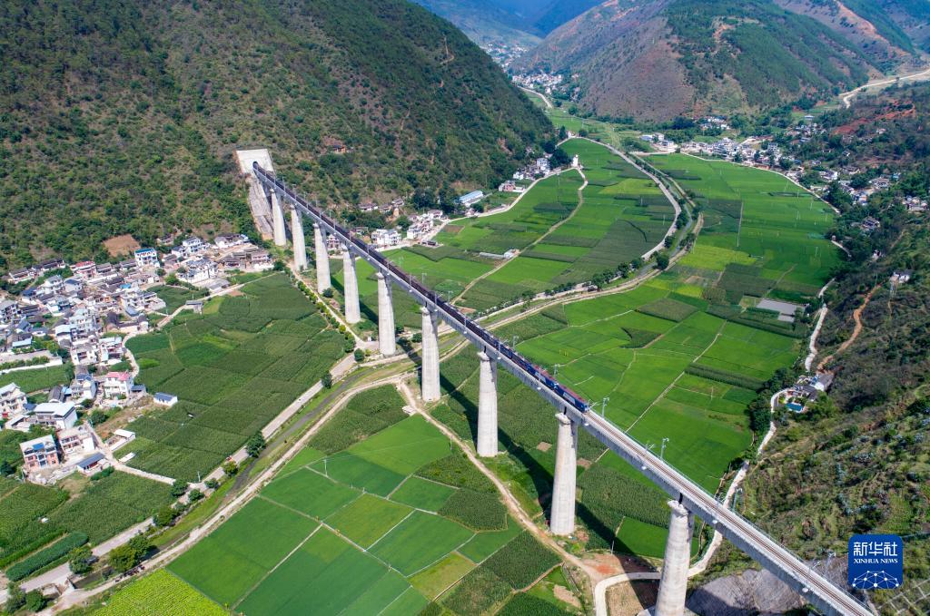 7月22日,货运列车通过大瑞铁路大保段杉阳2号特大桥(无人机照片)。新华社记者 陈欣波 摄
