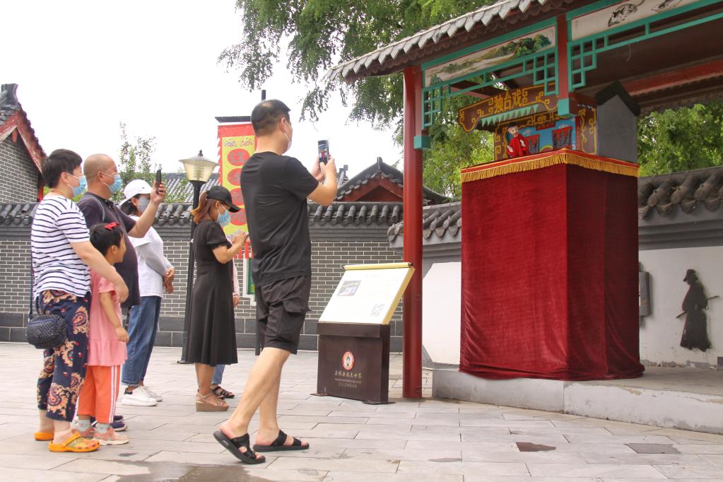 在吴桥杂技大世界,几位游客驻足观看独台戏表演。