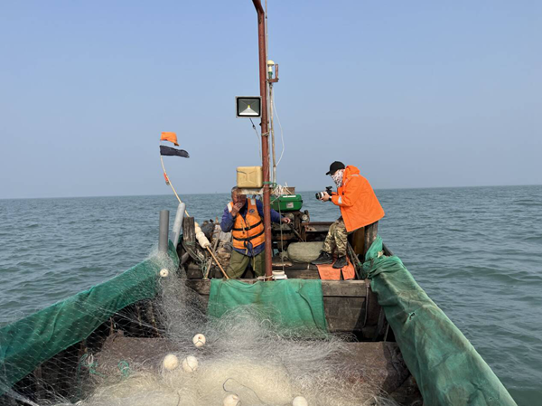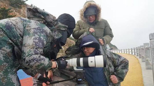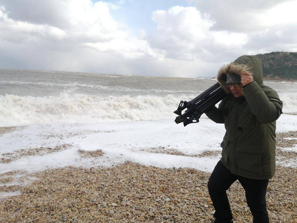 开海是我们拍摄的重要节点。去年9月1日凌晨三点,大钦岛的渔船已经顶着一轮明月启动了马达。为了拍到月光下百舸争渡的场面,有一个摄像想尽量靠近水面寻找拍摄角度,但是周围太黑了,他并没有注意到脚下湿滑的海草,一下滑入海中,只听到“啊……”的一声,同事们闻声赶来,第一想法就是“救人!”,还没听清落水同事“别过来,滑!”的警告,我和另一个同事先后滑到了水中,没到脖子的海水已经有些刺骨,后面冲过来的同事扔下来一根绳子,落水摄像高举着没有进水的机器喊:“先保护机器!”还好,一切有惊无险,这才真正叫做“过命的兄弟”!
