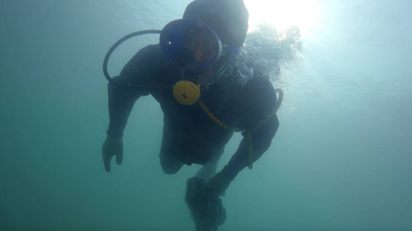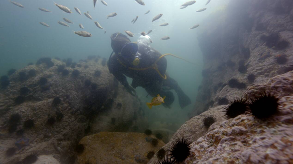 王萌冒着潜水病的危险,在水下寻找了一个星期,就为了找一块拍出来好看的礁石。这次我们拍摄了“猛子”捞海胆、捕海参鲍鱼、“水下森林”海带等美轮美奂的水下画面。吕芃台长称王萌是“山东广播电视台第一个水下摄影师”。