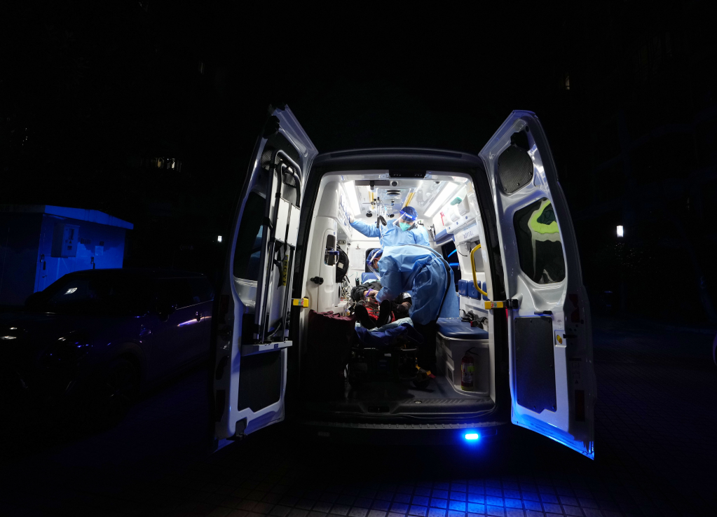 上海市医疗急救中心十院分站的急救医生正在对患者进行紧急治疗。新华社记者 刘颖 摄