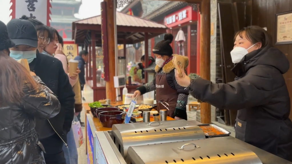 游客在陕西白鹿原影视城景区购买小吃。(视频截图)