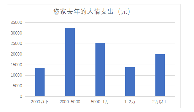 问卷结果显示,在所有问卷地区中,去年家庭人情支出为2000元以下的占比为12.88%,居于2000-5000元区间的占比为30.88%,居于5000-1万元区间的占比为24.07%,居于1-2万元区间的占比为13.20%,超过2万元的占比为18.97%。