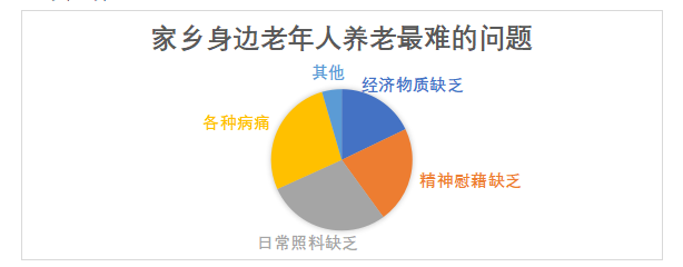 问卷结果显示,28%的问卷认为家乡身边老年人养老最难的问题是日常照料缺乏,27%的问卷认为家乡身边老年人养老最难的问题是各种病痛,22%的问卷认为家乡身边老年人养老最难的问题是精神慰藉缺乏,18%的问卷认为家乡身边老年人养老最难的问题是经济物质缺乏。