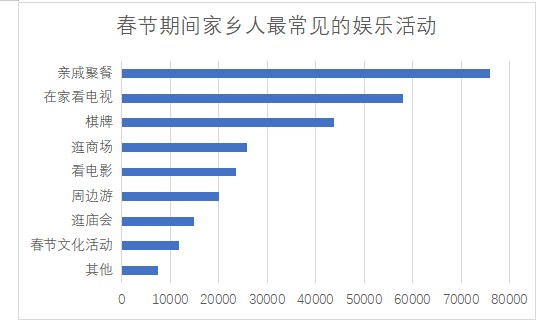 问卷结果显示,72.28%的问卷认为春节期间家乡人最常见的娱乐活动为亲戚聚餐,55.30%的问卷认为春节期间家乡人最常见的娱乐活动为在家看电视,41.67%的问卷认为春节期间家乡人最常见的娱乐活动为棋牌类活动,24.52%的问卷认为春节期间家乡人最常见的娱乐活动为逛商场,22.45%的问卷认为春节期间家乡人最常见的娱乐活动为看电影,19.16%的问卷认为春节期间家乡人最常见的娱乐活动为周边游,14.19%的问卷认为春节期间家乡人最常见的娱乐活动为逛庙会,11.31%的问卷认为春节期间家乡人最常见的娱乐活动为春节文化活动。