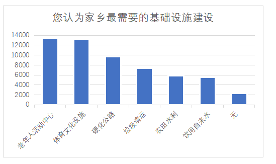 问卷结果显示,23.30%的问卷认为自己家乡最需要的基础设施建设为老年人活动中心,22.93%的问卷认为自己家乡最需要的基础设施建设为体育文化设施,16.96%的问卷认为自己家乡最需要的基础设施建设为硬化公路,12.86%的问卷认为自己家乡最需要的基础设施建设为垃圾清运,10.21%的问卷认为自己家乡最需要的基础设施建设为农田水利,9.77%的问卷认为自己家乡最需要的基础设施建设为饮用自来水。