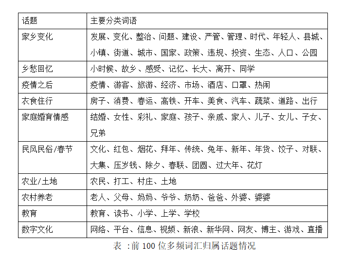 对4593条优质博文选择名词大类和动词大类进行分词整理和新词挖掘,并在此基础上基于出现词语的频数和微博条数进行统计,筛选出前100个高频词汇(见相关词云图),再根据该高频词的网络关系进行话题归类,最后概括出如下十个热点话题。它们分别是:家乡变化、乡愁回忆、疫情之后、衣食住行、家庭婚育情感、民风民俗、农业/土地、农村养老、教育、数字文化。