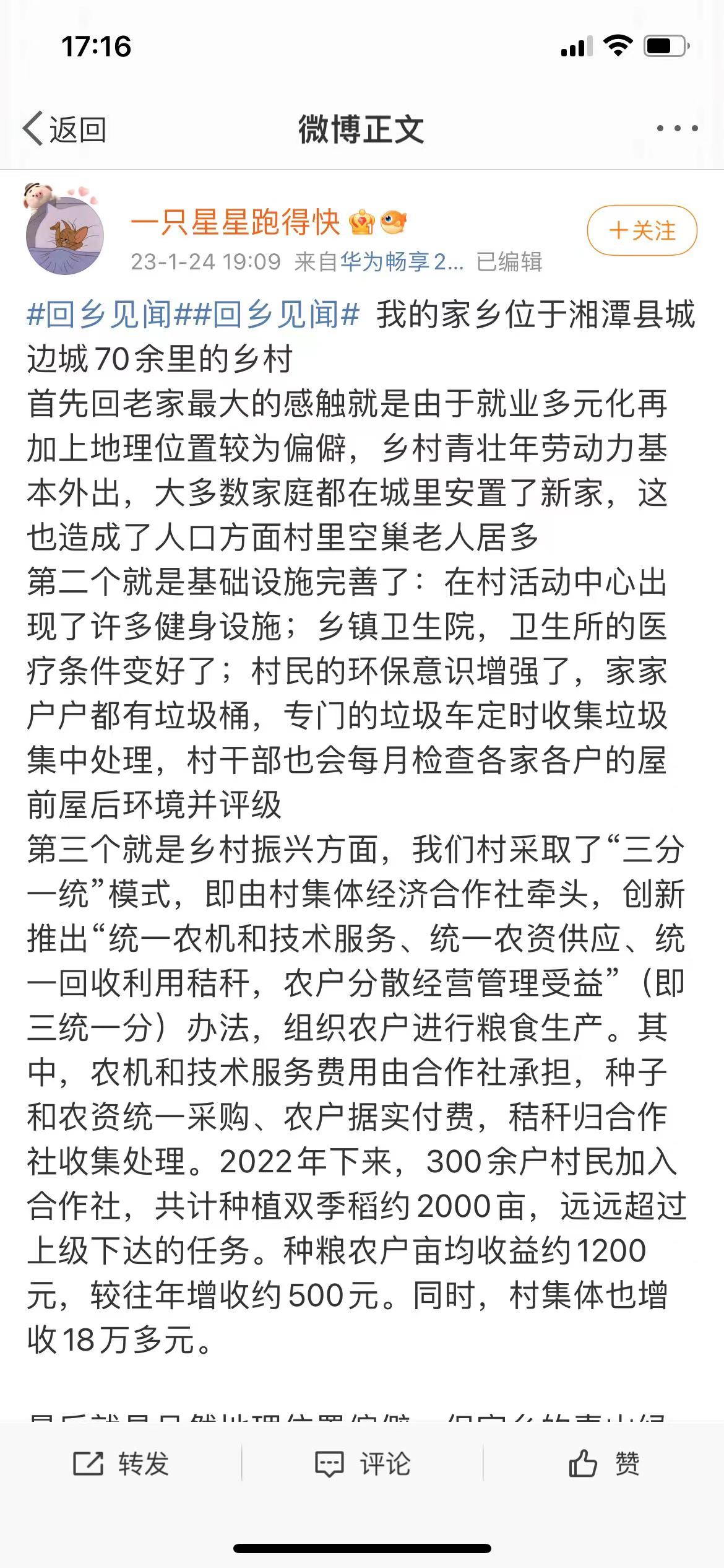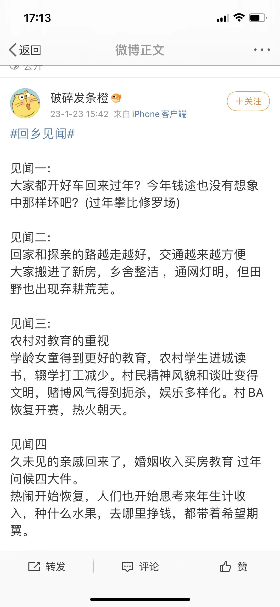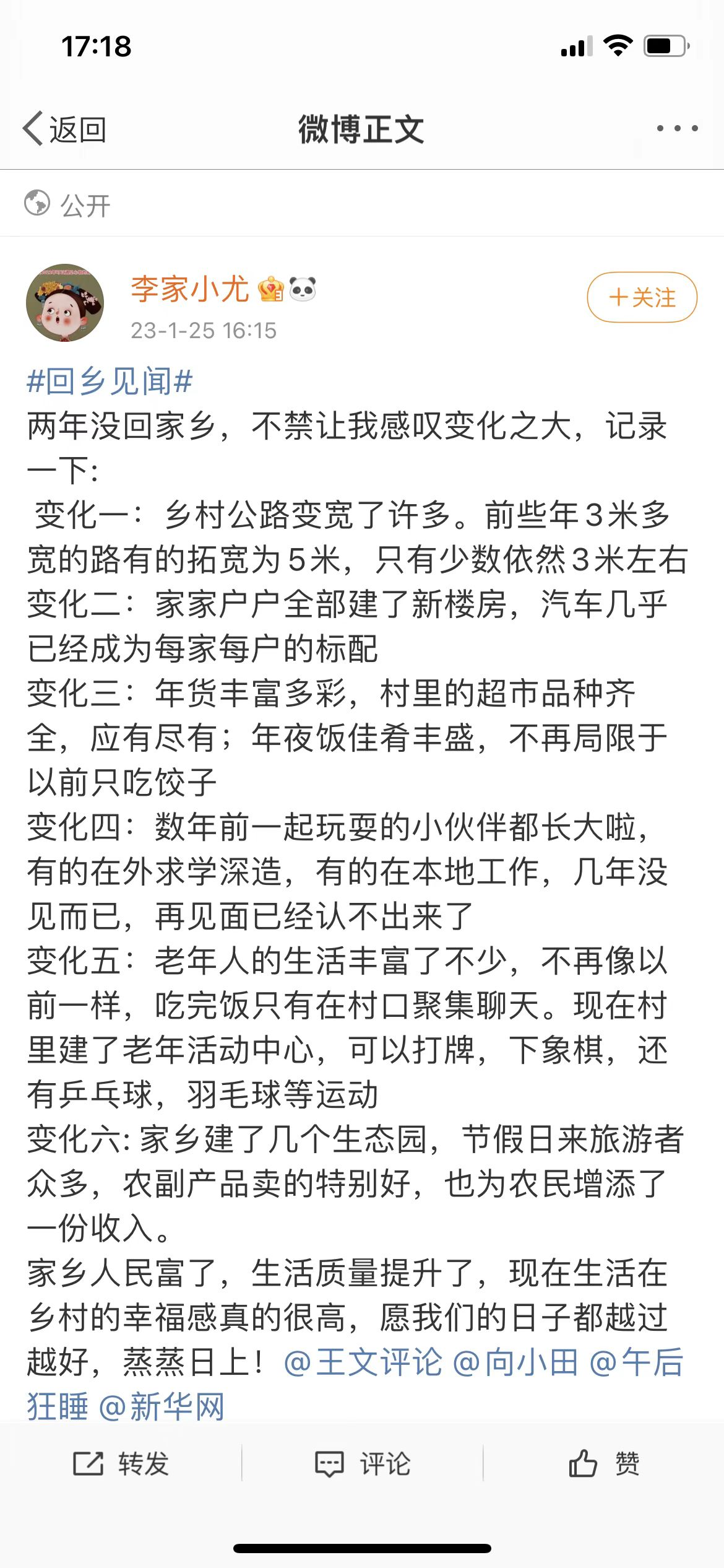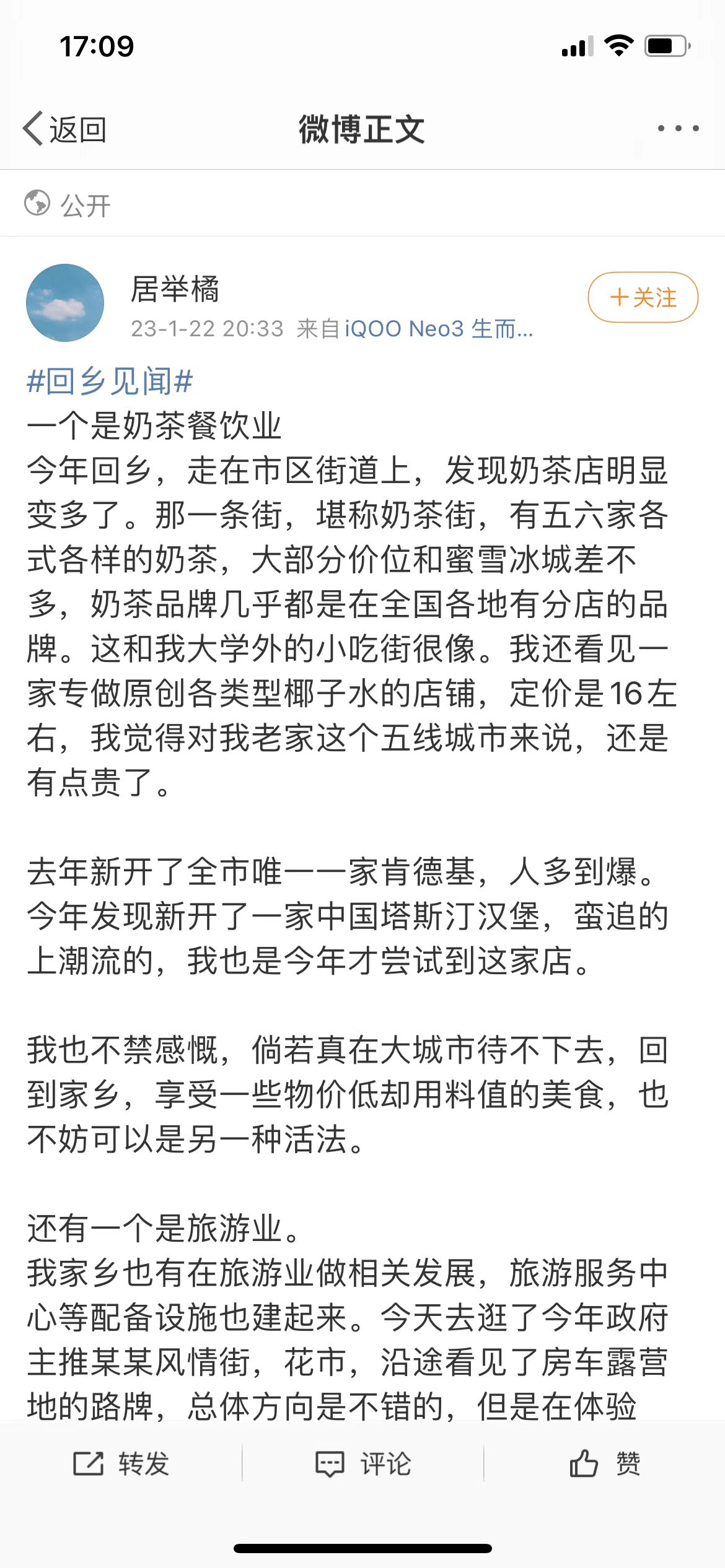 虽然经历了三年疫情,但是在网友们发表的微博中,乡村并没有日渐萧条,相反呈现出蒸蒸日上的景象。有人说“这几年不曾回来,未曾想过原来老家竟然发展的这么快”。其中最大的表现是,买车的人越来越多,农村也为停车、堵车问题而发愁。更多的微博在描述,农家乐、网红打卡点、主题乐园、户外等新鲜事物,以及环境治理效果显著,山更青水更绿了。另一个大的变化在于,一些电商和互联网平台下沉到了村里,以及一些全球化快餐连锁餐饮企业入驻村镇,正在改变和融入村民的日常生活。