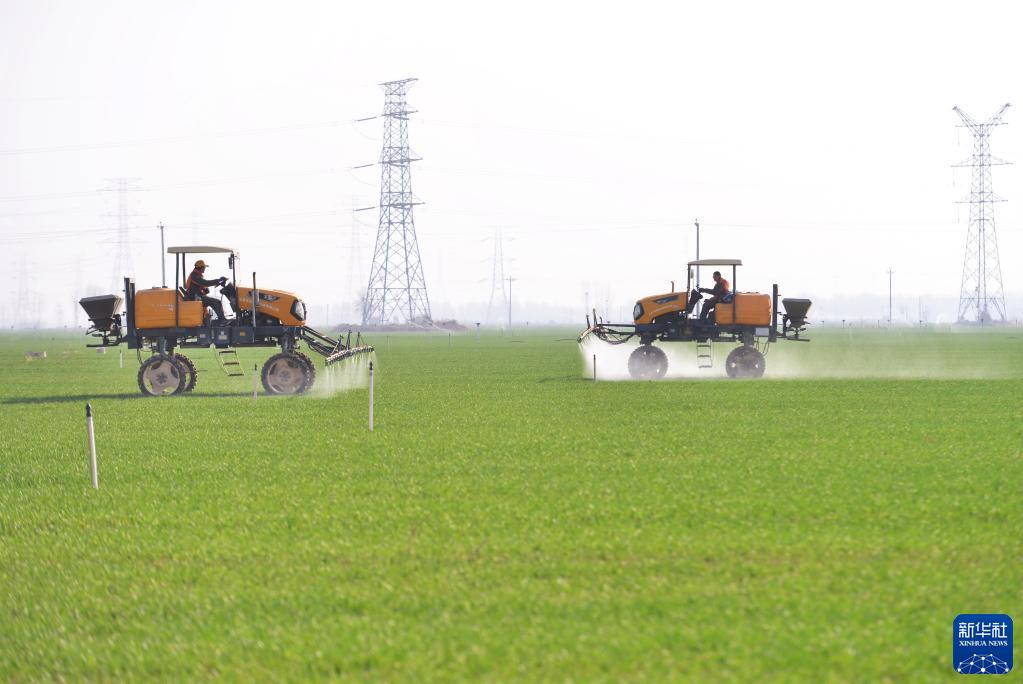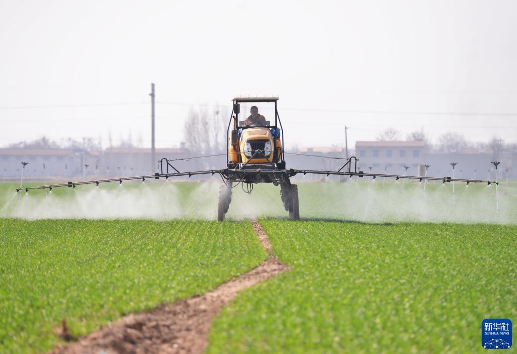 3月14日,河北省晋州市槐树镇北白水村一家农业合作社的社员在操作机械设备给冬小麦喷洒农药。 新华社记者 杨世尧 摄