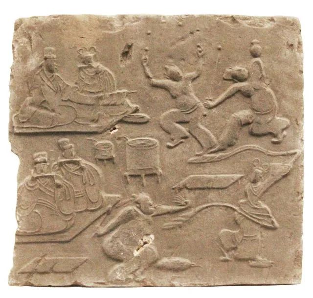 ▲汉代丸剑宴舞画像砖,1972年大邑安仁出土,四川博物院藏。