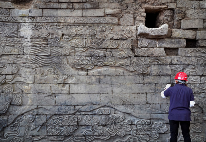 工作人员在清理河南开封州桥遗址出土的石雕祥瑞壁画。新华社记者李安摄