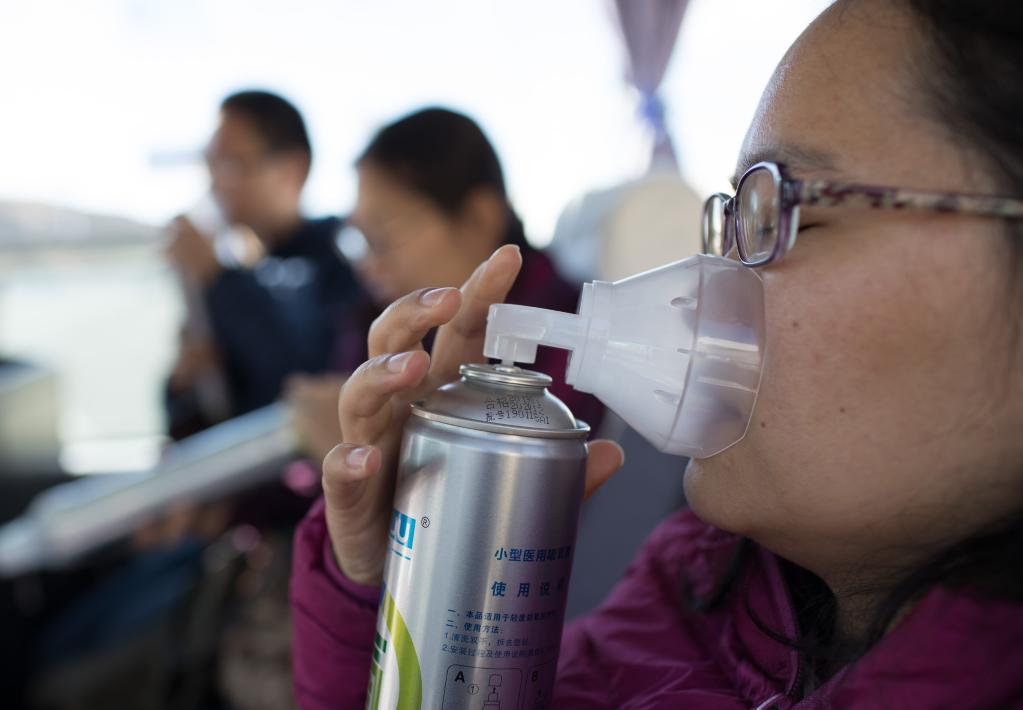 ↑抵达机场不久的中科院高能物理研究所马玲玲博士,吸氧缓解高原反应带来的不适(2019年4月27日摄)。