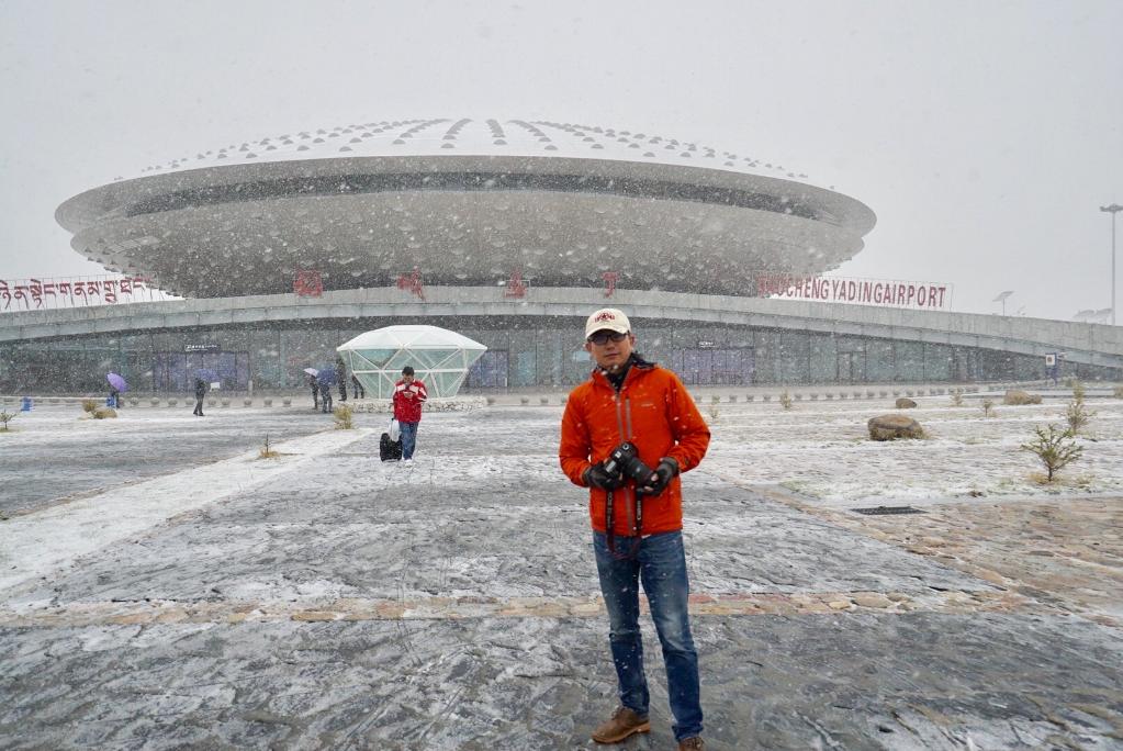↑2017年6月4日,走出飞碟造型的稻城亚丁机场,我在雪中留了张纪念照。走在我后面的是“拉索”项目办公室主任白云翔博士。
