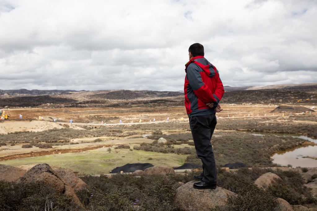 ↑“拉索”首席科学家曹臻在山头俯瞰建设中的项目(2017年6月4日摄)。