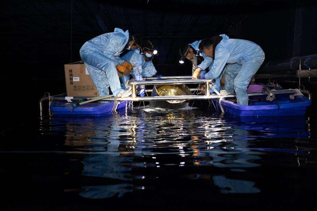 ↑工作人员在水切伦科夫探测器阵列(WCDA)三号水池里更换实验设备(2023年4月21日摄)。