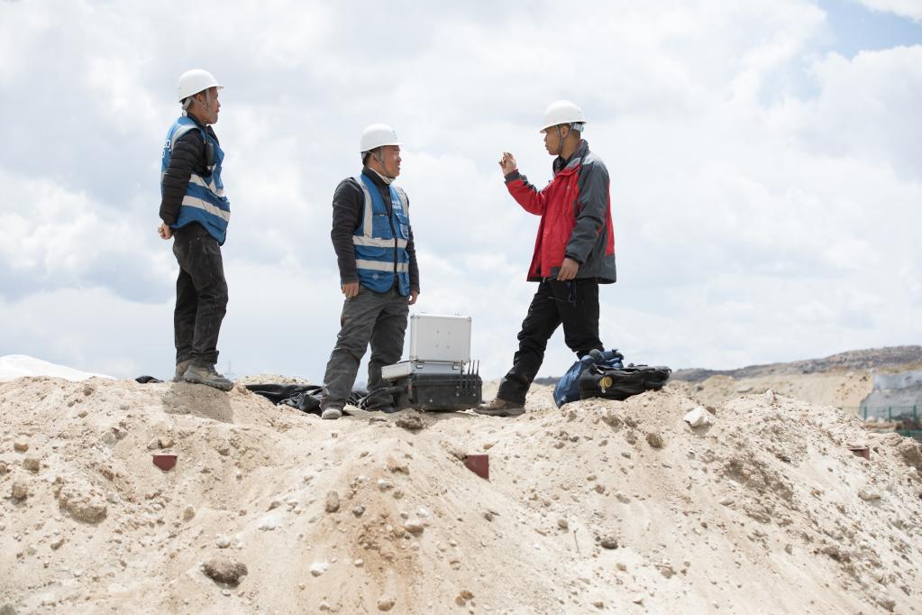 ↑2017年6月4日,“拉索”项目建设现场,工人们在施工。