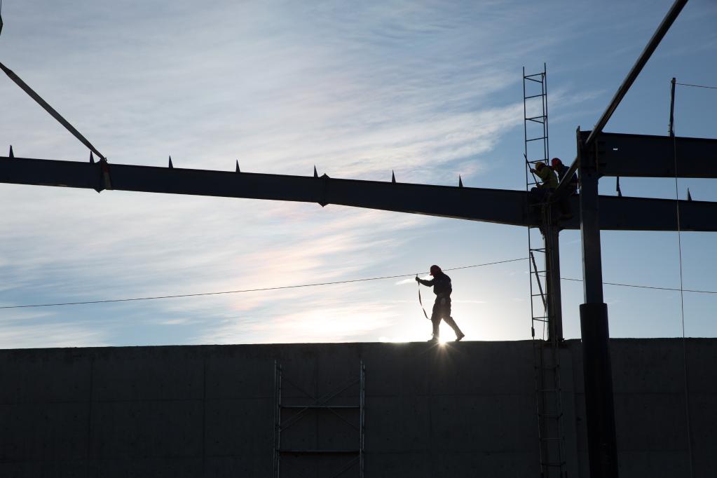 ↑工人们在架设观测基地WCDA水池的顶棚钢梁(2017年11月17日摄)。