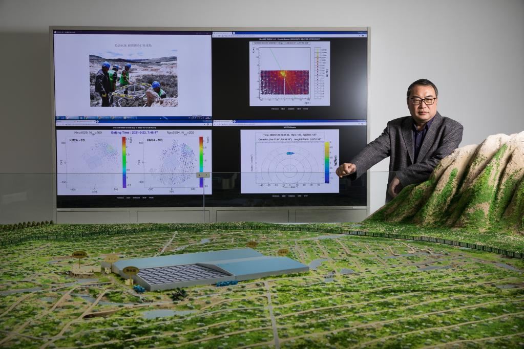 ↑中科院高能物理研究所研究员曹臻在高海拔宇宙线观测站沙盘前留影(2021年2月23日摄)。2021年5月17日,中国科学院高能物理研究所公布,国家重大科技基础设施“高海拔宇宙线观测站(LHAASO)”记录到1400万亿电子伏特(1.4PeV)的伽马光子,这是人类迄今观测到的最高能量光子,有助于进一步解开宇宙线的奥秘。研究成果17日在国际知名学术期刊《自然》发表。
