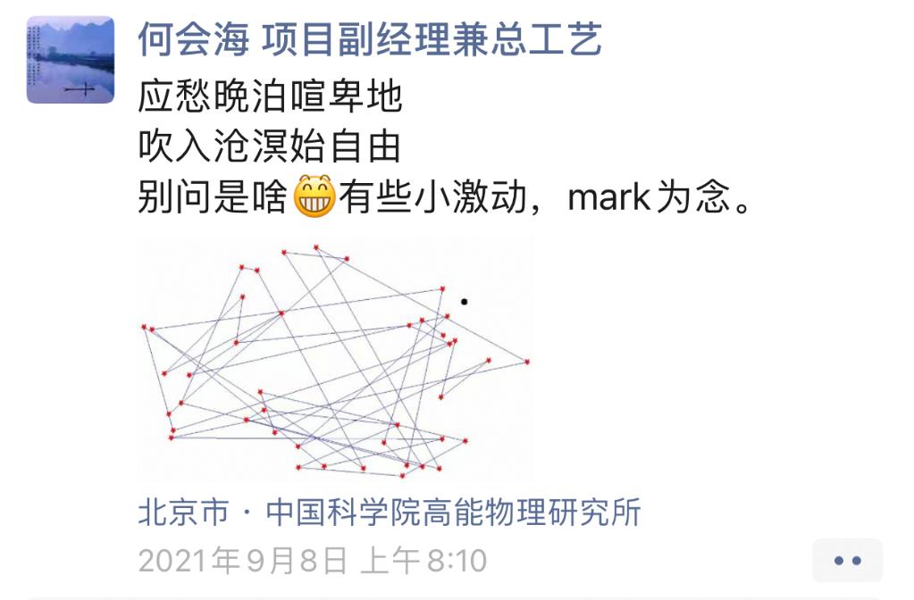 2021年9月8日早上8:10,他在朋友圈发了一张由许多红点连接而成、密密麻麻的示意图,并配了诗歌:“应愁晚泊喧卑地,吹入沧溟始自由”,称自己“有些小激动”,发朋友圈作为纪念。