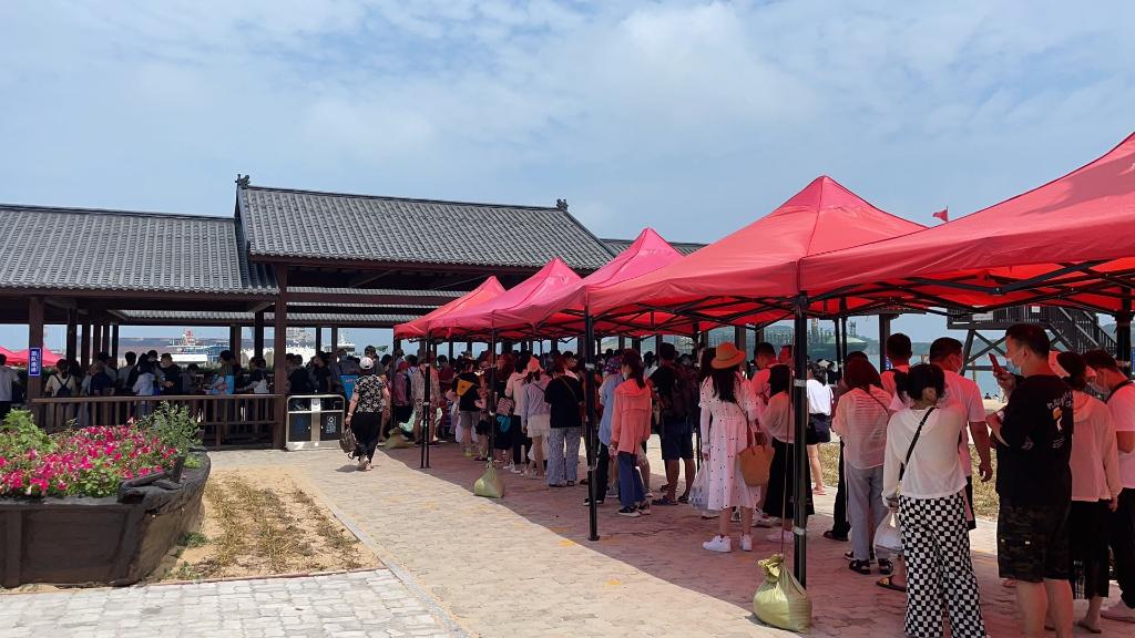 游客在威海港龙眼湾港区的陆岛交通码头排队登船。新华社记者李志浩 摄