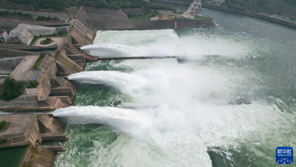 黄河小浪底水利枢纽开启3个闸门大流量下泄(6月21日摄,无人机照片)。新华社记者 刘诗平 摄