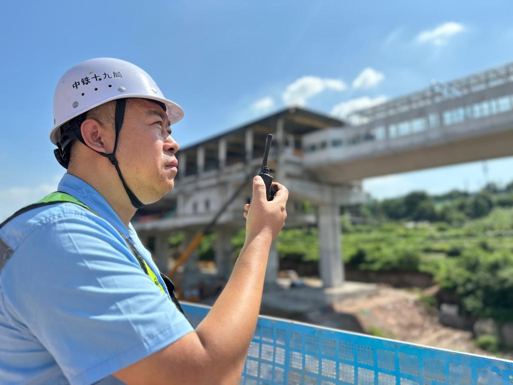 山城重庆,轨道交通18号线建设现场。25日中午,中铁十九局项目负责人陈峰穿梭在各个工序之间,查看钢筋绑扎质量、检查桥墩支架体系搭建是否符合方案,盯守吊车操作是否符合规范……他身上的工服被汗水浸出了一层层白色的盐渍。