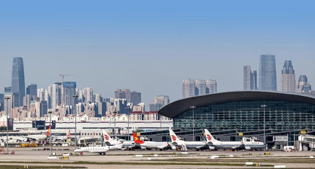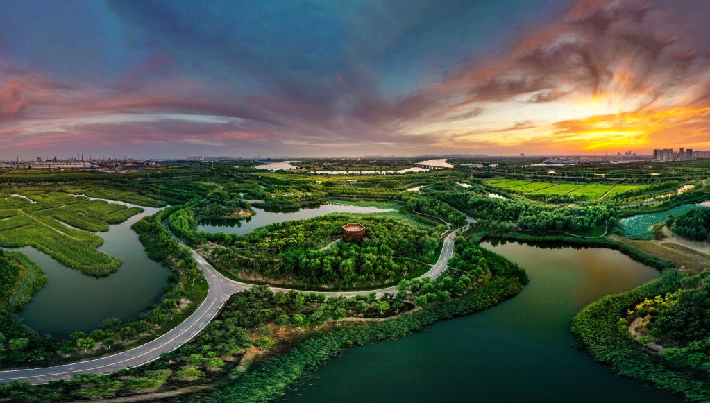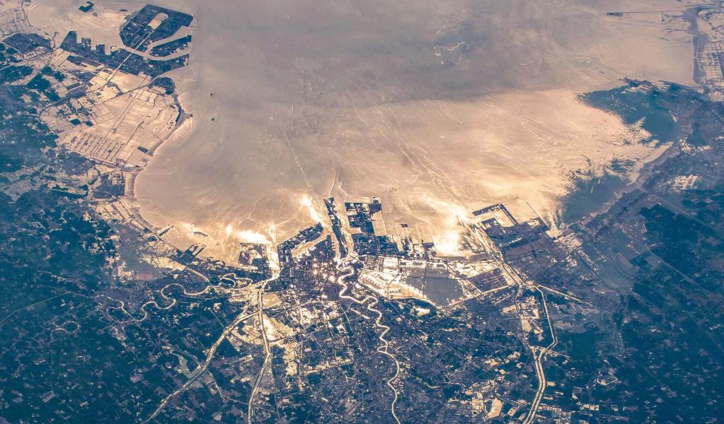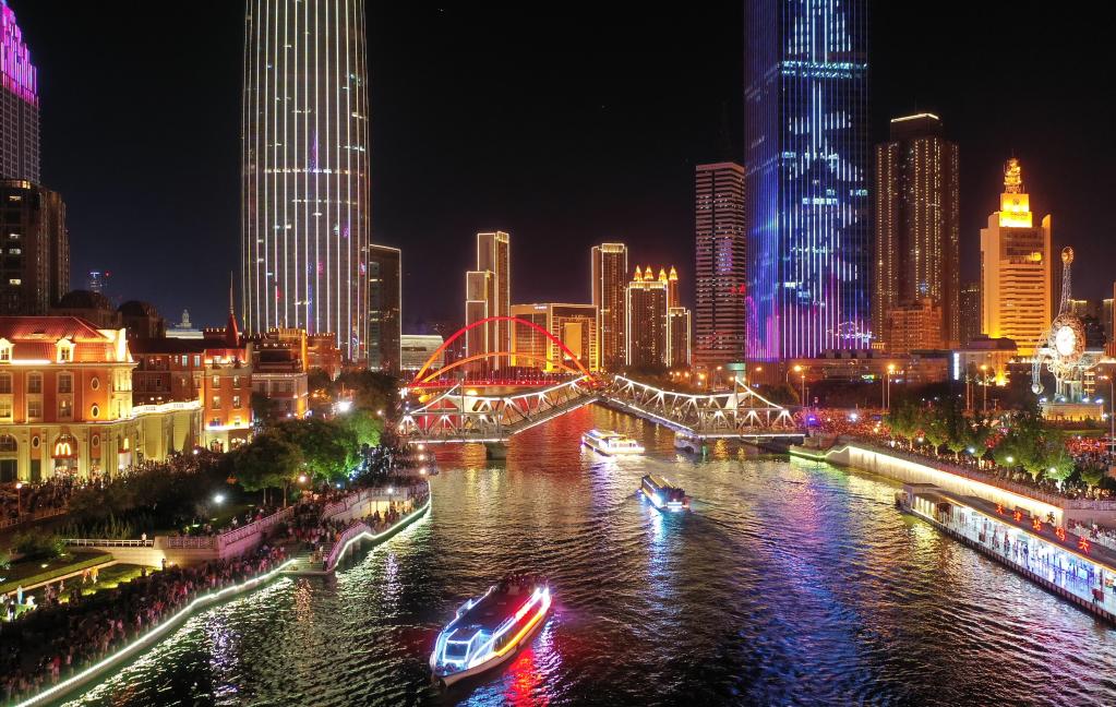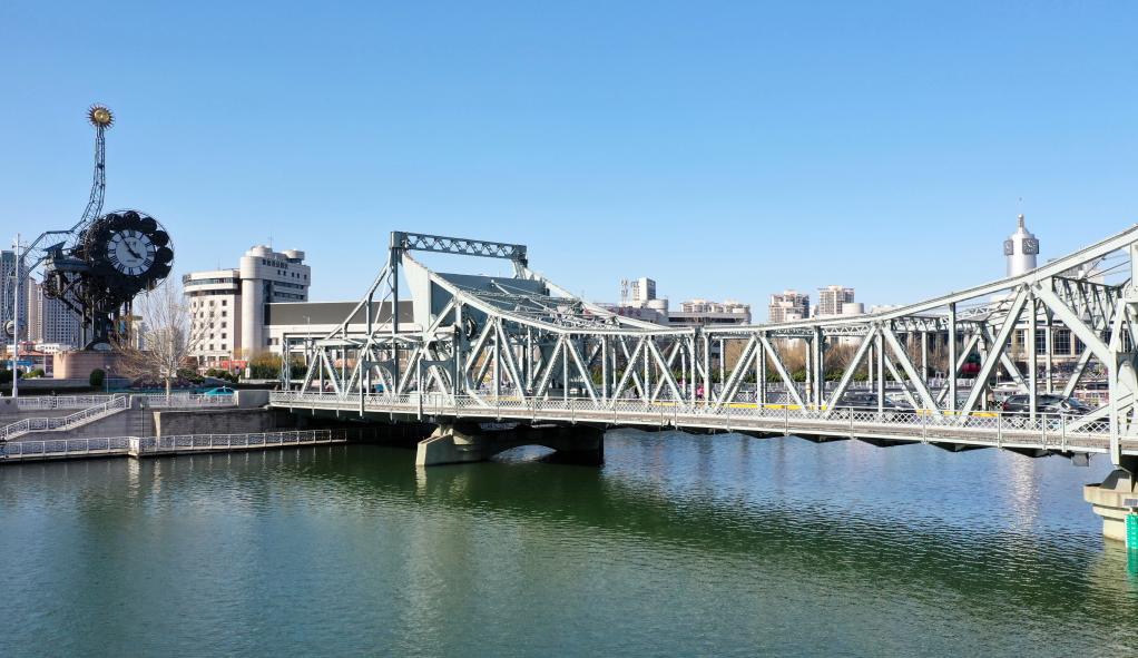 一艘集装箱船停靠在天津港的“七彩码头”。