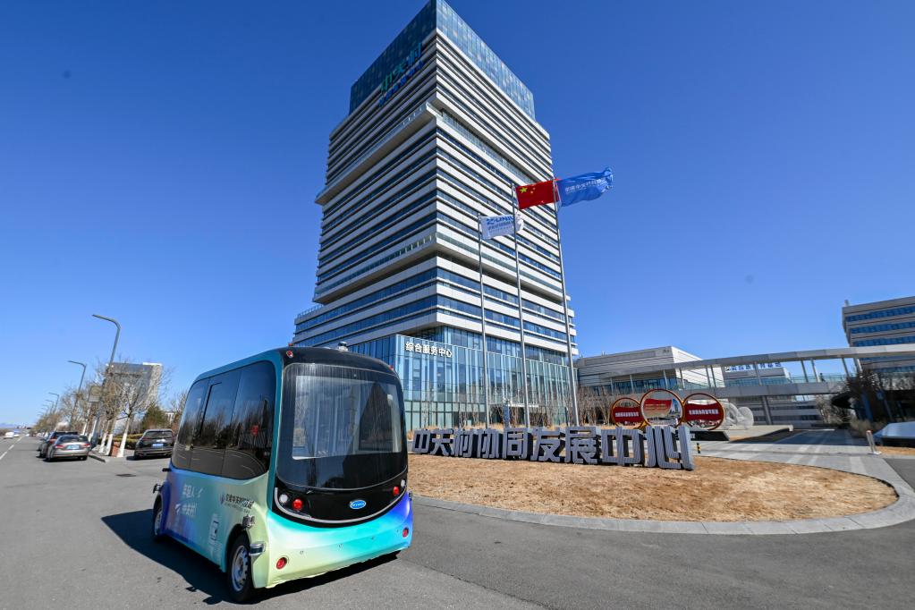一辆无人驾驶汽车停靠在京津中关村科技城协同发展中心前。