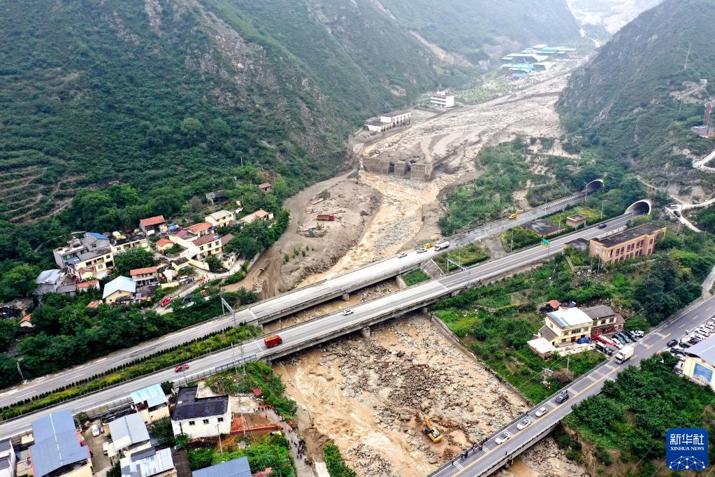 这是6月27日拍摄的四川省汶川县绵虒镇板子沟泥石流灾害现场(无人机照片)。新华社发