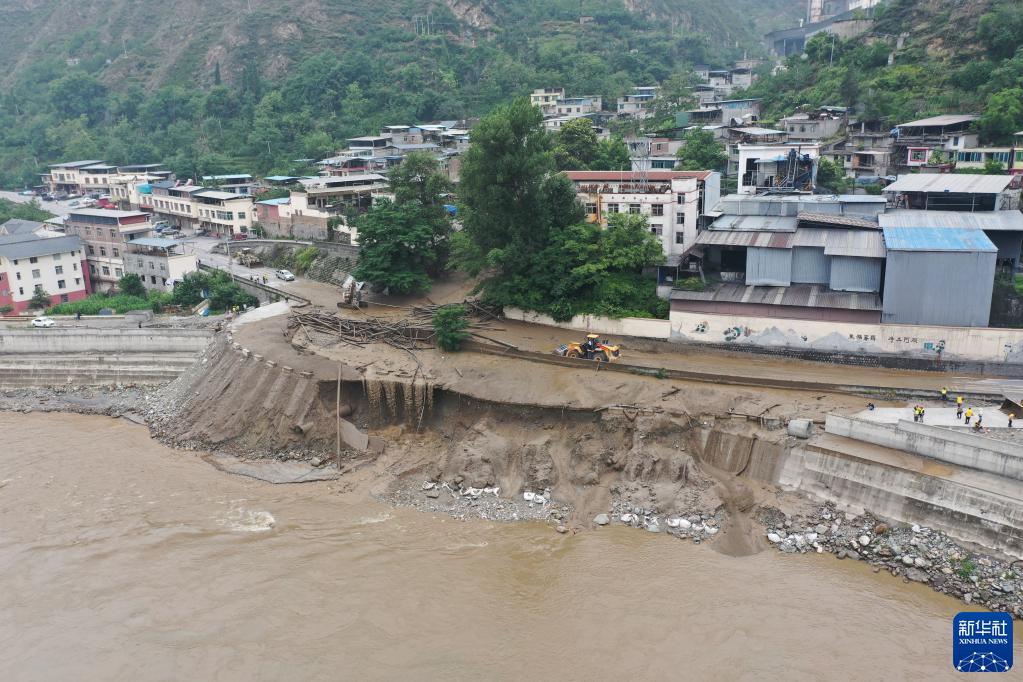 6月27日,在四川省汶川县威州镇新桥沟,抢险车辆在施工(无人机照片)。新华社发