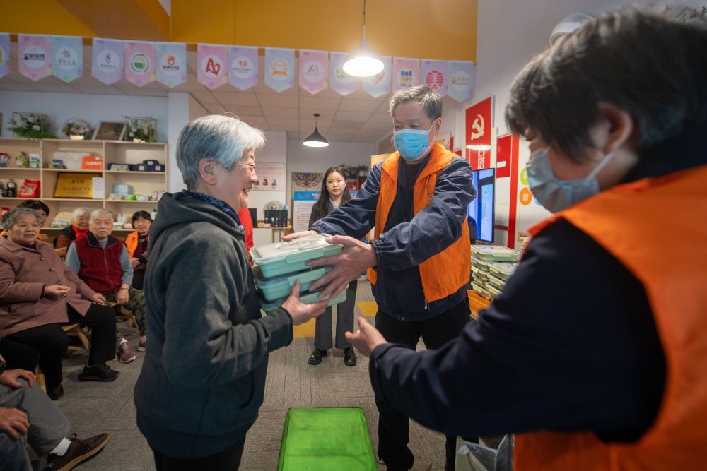 杭州市上城区南星街道白塔岭社区志愿者在社区服务驿站为老人发放免费爱心午餐(2022年11月23日摄)。新华社记者 江汉 摄
