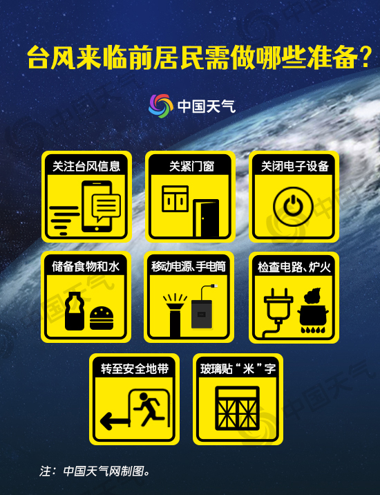 在台风来临前,居民要及时收听、收看或上网查阅台风预警信息,了解政府的防台风行动对策;随后关紧门窗,关闭电脑、电视等电子设备;储备好食物和水,备好移动电源、手电筒等应急物品;检查电路、炉火、煤气等设施是否安全;居住在各类危旧住房、厂房、工棚的居民,要及时转移到安全地带;如果你已在结实的房屋里,可以在窗户玻璃上用胶布贴成“米”字图形,以防窗玻璃破碎。