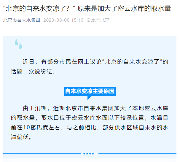 自来水变凉主要原因:由于汛期,近期北京市自来水集团加大了本地密云水库的取水量,取水口位于密云水库水面以下较深位置,水温目前在10摄氏度左右,与之前相比,部分供水区域自来水的水温偏低。