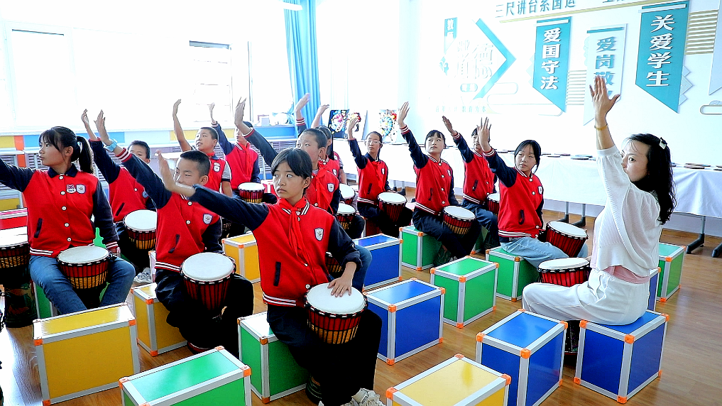 9月1日,兰州市二十九中小学部的学生练习表演非洲鼓。新华社记者 郎兵兵 摄