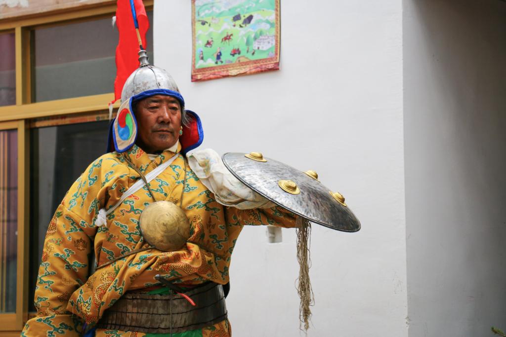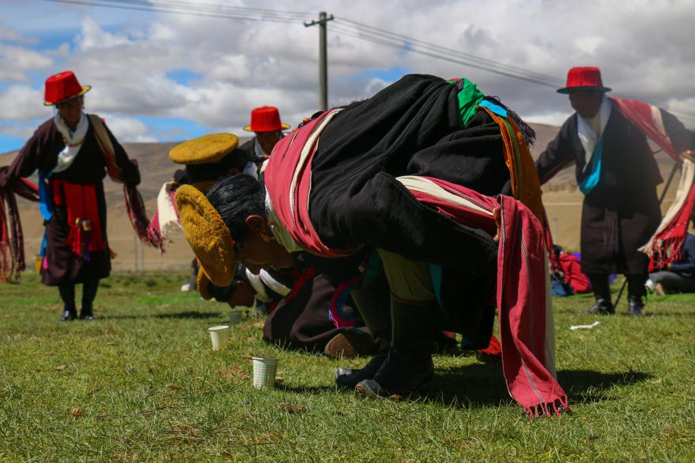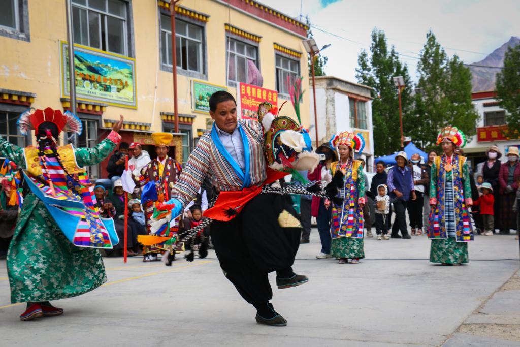 在赤德村,流传于此的宫廷礼仪舞蹈“仲”舞,距今已有百年历史,其中一幕是舞者头顶青稞酒壶给客人敬酒,以体现崇高的迎客礼仪。在西德村,“果尔孜”舞的“将士们”身着盔甲、头戴头盔、手持剑盾,和着由慢渐快的鼓声,赞美出征的将士、崇拜保家护国的兵器……