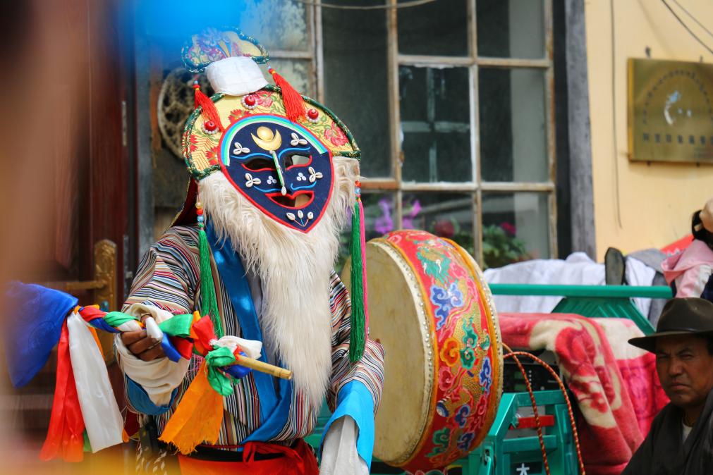 今年40岁的科迦藏戏团团长达瓦洛珠带领演员在村中心的科迦寺广场上表演《诺桑法王》选段,独具特色的唱腔和舞蹈绝活让人拍案叫绝。