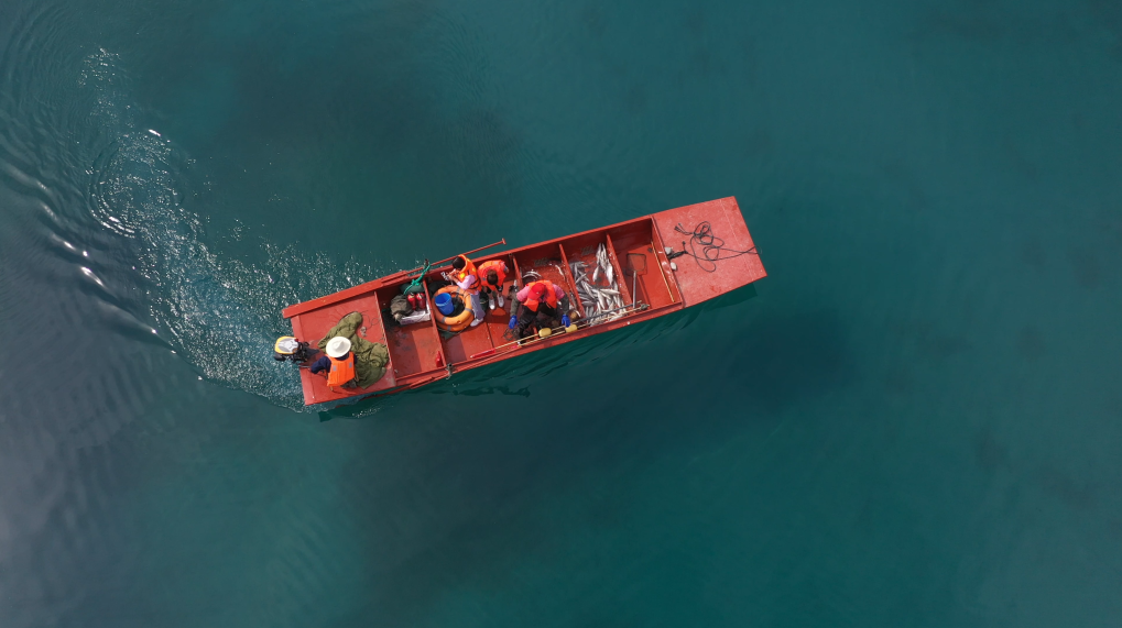 7月27日,无人机拍摄的新疆赛里木湖高白鲑捕捞现场。(新华社发/李强摄)