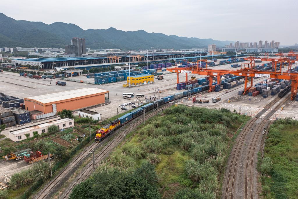 10月11日,一列西部陆海新通道班列从重庆团结村中心站驶出(无人机照片)。新华社记者黄伟 摄
