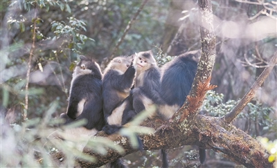 西南大样带白马雪山国家级自然保护区的云南铁杉林动态监测样地是滇金丝猴的栖息地。图为云南白马雪山国家级自然保护区拍摄的滇金丝猴。新华社记者 王冠森 摄