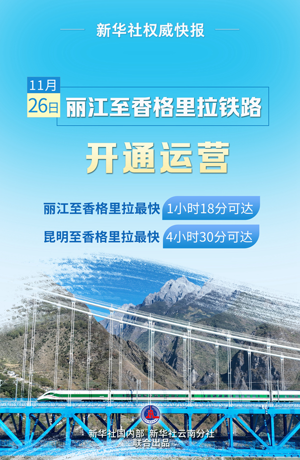 新华社昆明11月26日电(记者樊曦、丁怡全)26日,C9518次“复兴号”动车组列车从云南迪庆藏族自治州香格里拉站出发,向昆明方向飞驰而去。这标志着丽江至香格里拉铁路开通运营,丽江至香格里拉最快1小时18分可达,昆明经大理、丽江可直达香格里拉。