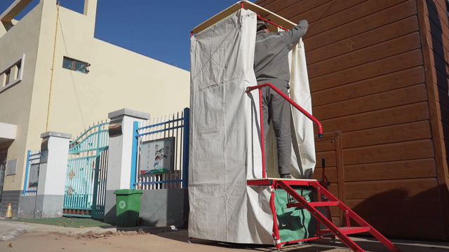 记者看到,一个“盒子厕所”打开或折叠只需十来分钟,折叠好的厕所只有0.4立方米。