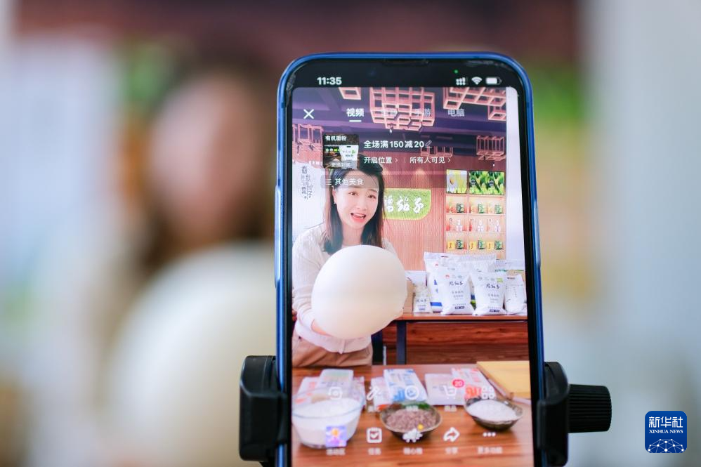 12月20日,奇台县腰站子村村民成红玉在村里的电商直播间介绍“腰站子”品牌有机面粉。新华社记者 张铖 摄