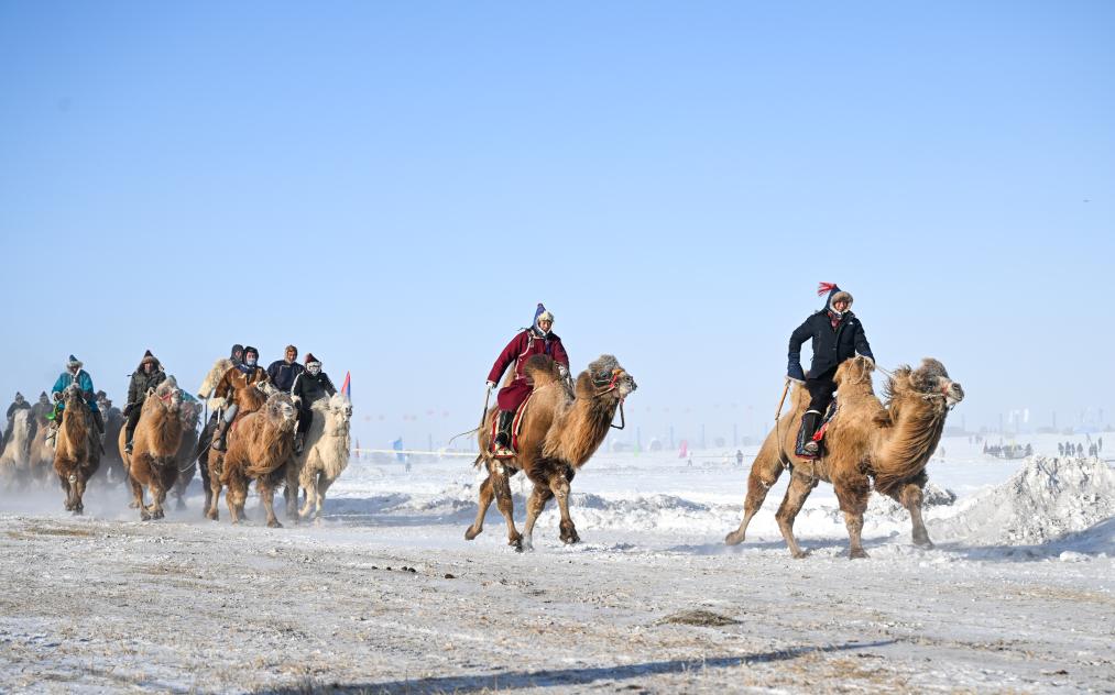 12月17日,选手在内蒙古自治区第二十届冰雪那达慕赛骆驼比赛中。新华社记者贝赫 摄
