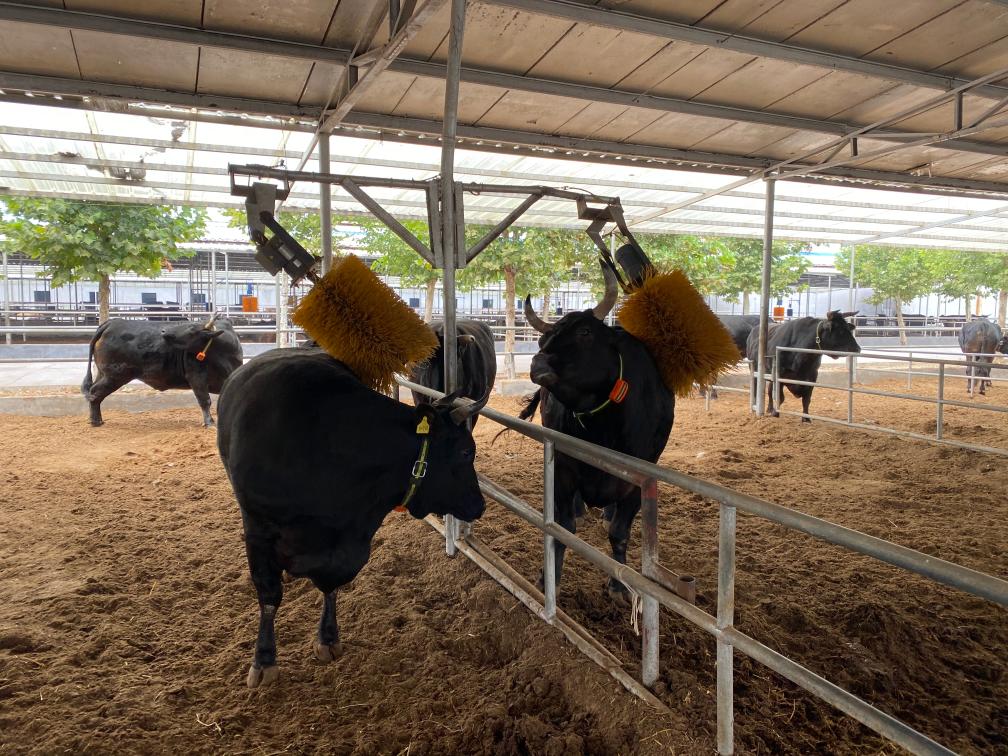 山东省淄博市高青县黑牛小镇里戴数字项圈的黑牛(资料照片)。新华社发